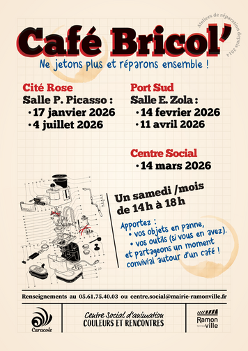 Le centre social "Couleurs et Rencontres" de la mairie de Ramonville Saint-Agne et l' Association Caracole, organisent un rendez-vous café Bricol', de 14h à 18h à la salle de quartier de port sud, 19 avenue Emile Zola, 31520 RAMONVILLE ST AGNE.