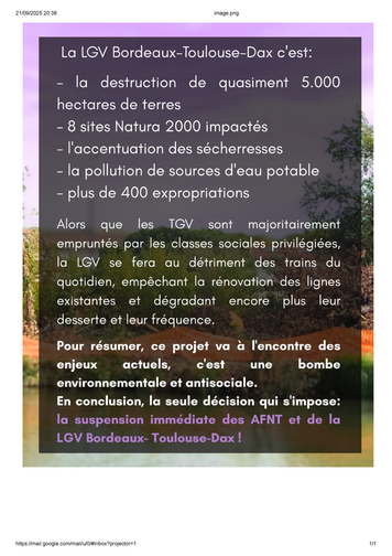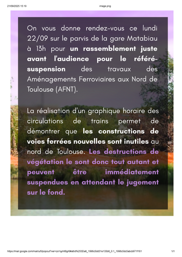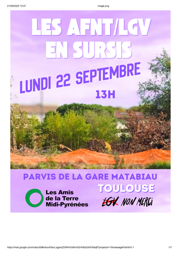 LUNDI 22 SEPTEMBRE à 14h référé suspension en audience au TA de Toulouse, RV 13h parvis de la gare Matabiau pour montrer notre opposition à ce projet écocide dont le chantier et la coupe d'arbres est déjà très avancée.