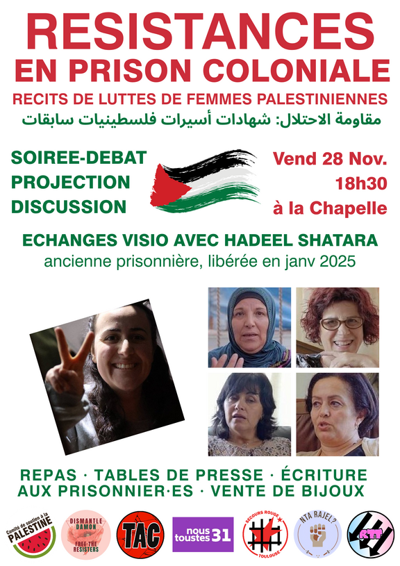 Nous organisons cet événement pour donner la parole à des femmes palestiniennes, prisonnières libérées. Elles témoigneront des différentes formes de résistance au colonialisme et de leur lutte pour la libération de la Palestine.