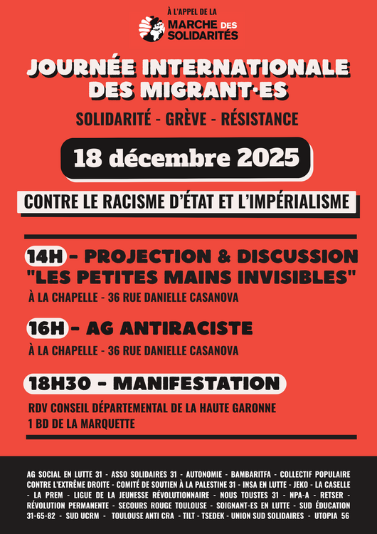 À l'appel de la Marche des Solidarités, nos collectifs, associations, partis politiques et syndicats appellent à la mobilisation, à la grève et à une marche antiraciste le jeudi 18 décembre, Journée internationale des migrant·es.