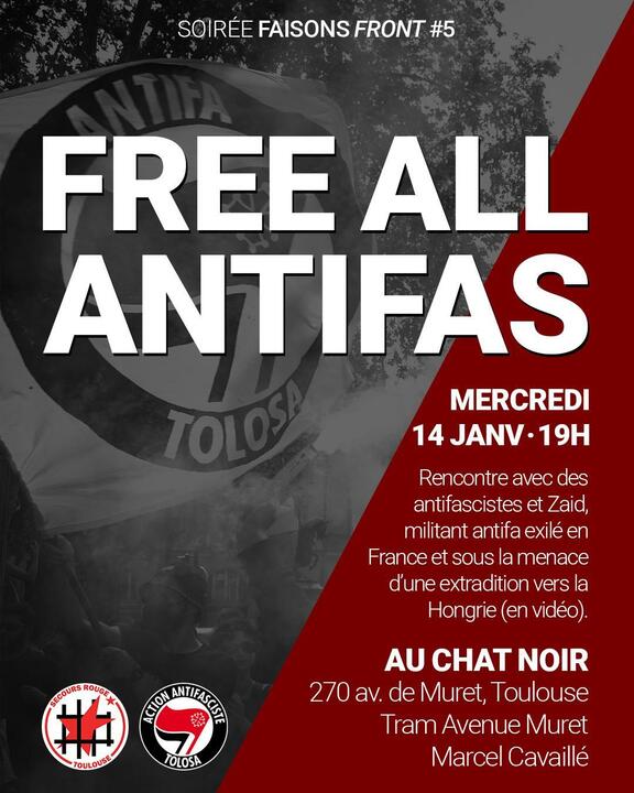 A l'occasion de la soirée Faisons Front #5 le mercredi 14 janvier à 19H au Chat Noir, le Secours Rouge Toulouse et l'AFA Tolosa organisent une rencontre avec des antifascistes et Zaid, militant antifa exilé en France et menacé d'extradition vers la Hongrie (en vidéo), afin de discuter et échanger sur les nécessaires solidarités à construire pour faire face à la criminalisation de l'antifascisme et construire notre autodéfense en toute indépendance de l'État.