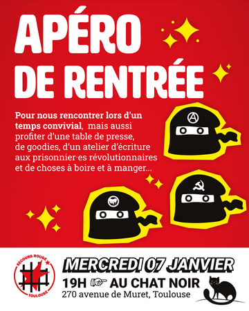 Rendez-vous le mercredi 7 janvier à 19h, au Chat Noir (270 avenue de Muret, Toulouse), pour un moment convivial afin de se rencontrer et d'échanger. Au programme : table de presse, goodies, atelier d'écriture aux prisonnier·es révolutionnaires, ainsi que de quoi boire et manger dans une ambiance chaleureuse.