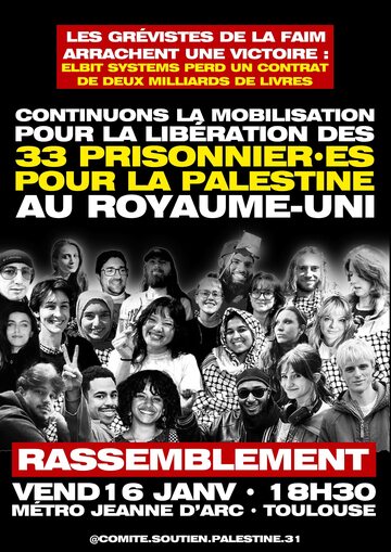 Le Comité de soutien à la Palestine 31 organise un rassemblement le vendredi 16 janvier à 18h30 a Jeanne d'Arc à Toulouse pour manifester notre soutien aux militant.tes de Palestine Action, pour exiger leur libération immédiate et pour dénoncer la répression contre la solidarité avec la Palestine au Royaume-Uni, en France et partout ailleurs dans le monde.