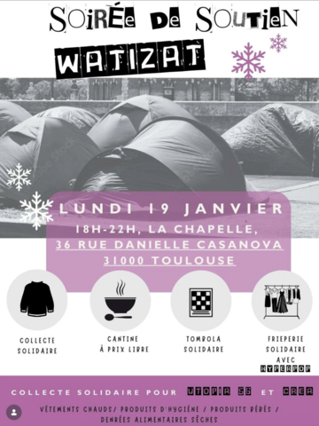 Retrouve nous à la relâche de la Chapelle à partir de 18h pour la soirée de soutien à Watizat - 36 rue Danielle Casanova