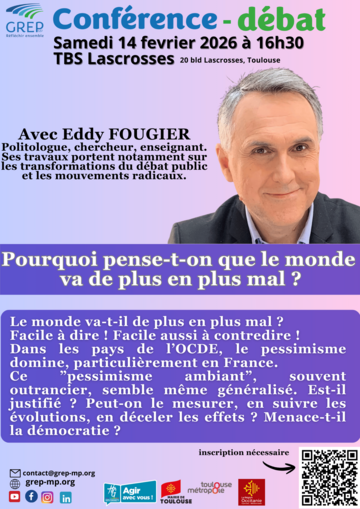 C'est entendu, les médias ne s'intéressent pas aux trains qui arrivent à l'heure. Seules les intéressent les nouvelles hors normes - le fameux banquier qui mord un chien - et mieux encore celles, dramatiques, qui captivent notre attention. Les médias ne sont pas seuls en cause. Réseaux sociaux, groupes de pression, associations, think tanks, politiques, nombreux sont ceux qui surfent sur nos nostalgies, nos émotions et nos peurs. Notre cerveau humain lui-même manifeste un « biais de négativité » sans doute utile à notre survie évolutive. Avec une conséquence nette : où que nous nous situions sur l'échiquier politique, le monde que nous percevons, largement noir et décadent, est souvent assez éloigné du monde réel. Non pas, que le monde soit uniformément rose mais, au moins dans les pays de l'OCDE et tout particulièrement en France, il est uniformément noirci par un pessimisme souvent outrancier et très généralisé. Nous vivons dans le pessimisme. Ce pessimisme est certes en partie fondé mais il comporte une part majeure sans lien avec la réalité. Ce pessimisme, trait de notre société, doit être étudié avec attention, avec les outils de la science. Il faut le définir, il faut le mesurer, il faut en suivre les évolutions dans le temps et les variations dans l'espace géographique et social, il faut en analyser avec précision les causes et les conséquences. Car ce pessimisme n'est pas neutre, il distord notre vision du monde, au point même de constituer d'après Eddy Fougier une menace réelle et directe contre la démocratie. Ce pessimisme ambiant -qui nous enveloppe et façonne malgré nous nos pensées et nos actions - ne peut pas ne pas intéresser le GREP ! Nous avons donc demandé à Eddy Fougier de nous en présenter les principaux aspects qu'il a décrits dans quelques-uns de ses ouvrages, notamment le plus récent « Pourquoi pense-t-on que le monde va de plus en plus mal ? Le fléau du pessimisme pour la démocratie ». Éditions de l'Aube 2025. Nous nous réjouissons qu'il ait accepté notre invitation.