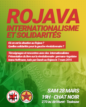 Soirée co-organisée par le Secours Rouge Toulouse et Young Struggle autour de l'actualité politique au Rojava et du sens de notre solidarité pour la gauche révolutionnaire en Europe. Lors de cet événement, nous aurons le plaisir de présenter le livre « Une vie emplie d'amour et d'espérance », retraçant le parcours de la militante queer et communiste germano-togolaise Ivana Hoffmann, tombée au combat contre Daesh en 2015 à seulement 19 ans. La soirée sera également ponctuée par le témoignage vidéo d'un internationaliste révolutionnaire récemment revenu du Rojava au début de l'année 2026.