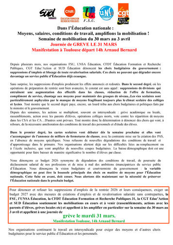 Pour dénoncer et refuser les suppressions d'emplois de la rentrée 2026 et leurs conséquences, exiger un budget 2027 avec des mesures de créations d'emplois et de revalorisation salariale sans contreparties, la FSU, l'UNSA Éducation, la CFDT Éducation Formation et Recherche Publiques 31, la CGT Educ'Action et SUD Éducation soutiennent les mobilisations en cours et à venir (rassemblements, actions avec les parents d'élèves, grèves locales etc) et appellent à les amplifier en particulier sur la semaine du 30 mars au 3 avril et appellent à une journée de