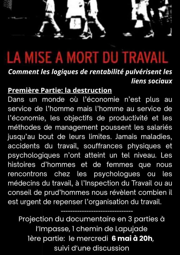Projection d'un documentaire contre le taf sorti en 2009, le mercredi 6 mai à l'Impasse (1 bis impasse Lapujade) à 20h, suivi d'une discussion !
